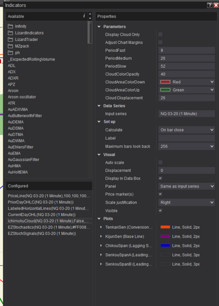 If you find that only the cloud is plotting in NT8 it is because you have the indicator setting box check for "display cloud only" uncheck that box you will get the other components to plot on your chart. Also you will notice in NT8 Ichimoku settings that there are plots for senekou A and B at the bottom of the indicator setting box, choose to change the color on those to transparent. I don't know why they have those there, they are not necessary. (attached is a screenshot of the NT8 settings.)